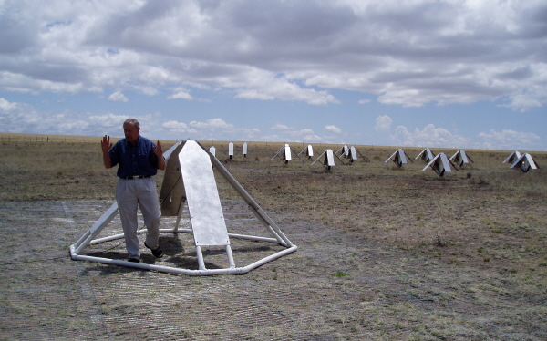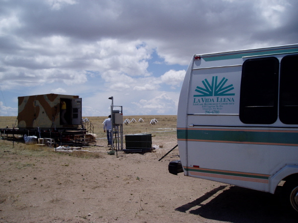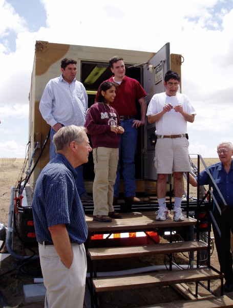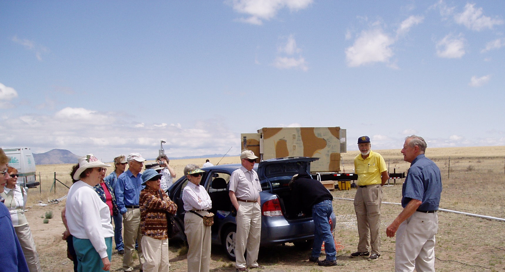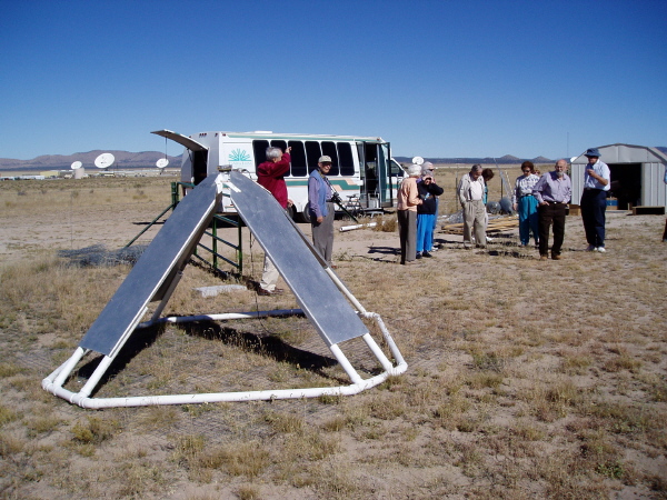 Left:   La Vida Llena residents tour the LWDA again on October 24, 2007. Prof. John (far right) explains the LWDA. One of the big blade antennas is in the foreground with the LVL van and VLA in the background.